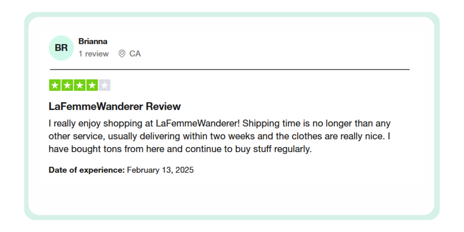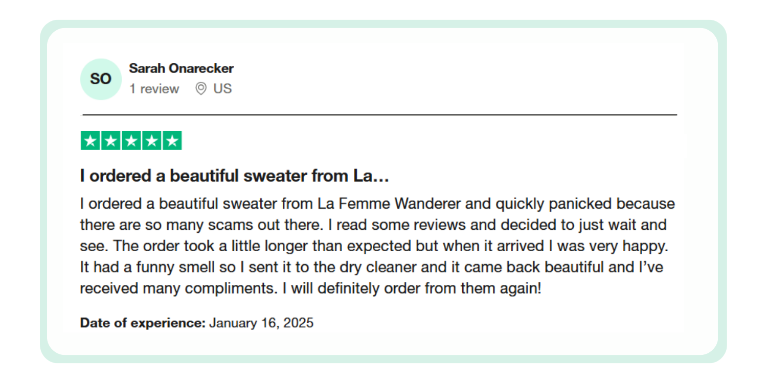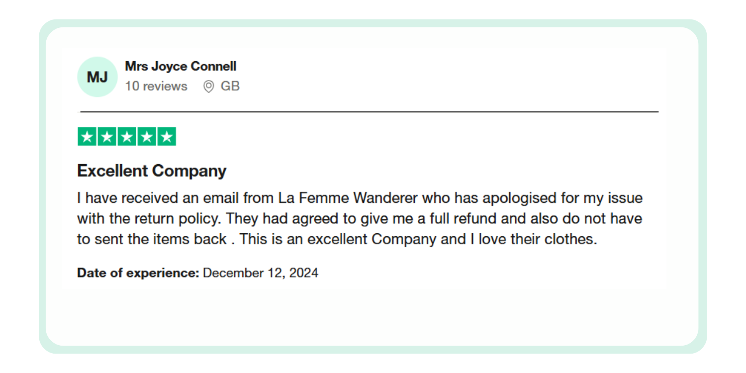 Στην LA FEMME WANDERER, πιστεύουμε στην οικοδόμηση διαρκών σχέσεων με τους πελάτες μας μέσω εξαιρετικής εξυπηρέτησης. Η έμπειρη και φιλική ομάδα εξυπηρέτησης πελατών μας είναι διαθέσιμη για να απαντήσει στις ερωτήσεις σας και να επιλύσει άμεσα τυχόν προβλήματα. Από ερωτήσεις πριν από την αγορά έως υποστήριξη μετά την αγορά, είμαστε εδώ για να διασφαλίσουμε ότι η εμπειρία αγορών σας θα είναι απρόσκοπτη και ευχάριστη.